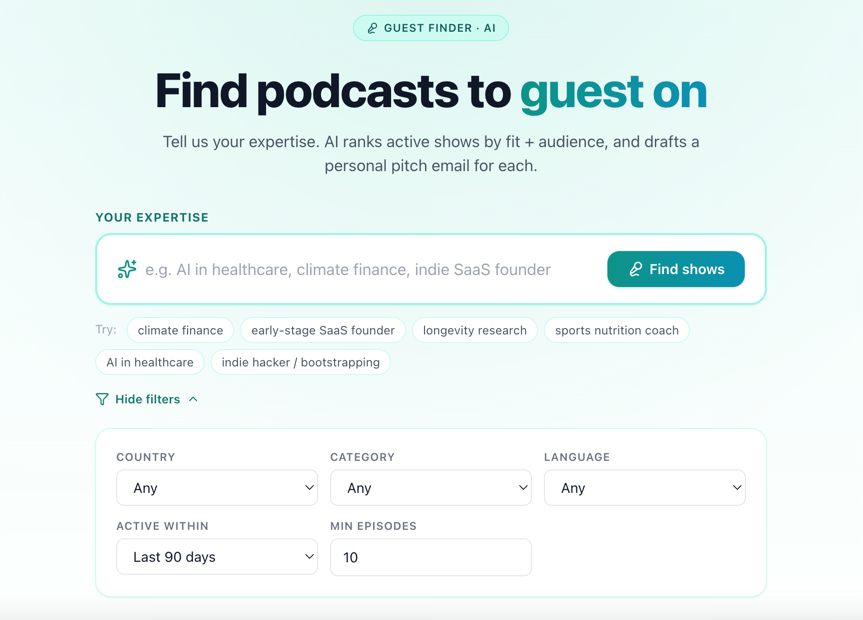 Getting booked on podcasts is the highest-leverage distribution play of the decade. One 45-minute interview on the right show outperforms a month of LinkedIn posts. But finding those shows manually is brutal: hours Googling "top [your topic] podcasts", twenty open tabs, generic pitches sent into the void. Reply rate: 4%. Half the replies are auto-responders from feeds that died in 2022.